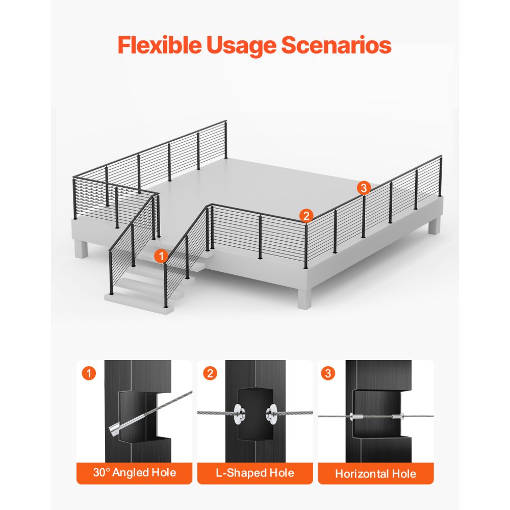 Protección para múltiples escenas: Nuestro poste de riel de cable es adecuado para protección tanto en interiores como en exteriores, incluidas terrazas, escaleras, porches, cercas, patios, balcones, jardines, edificios residenciales, oficinas comerciales, hoteles, garajes y más