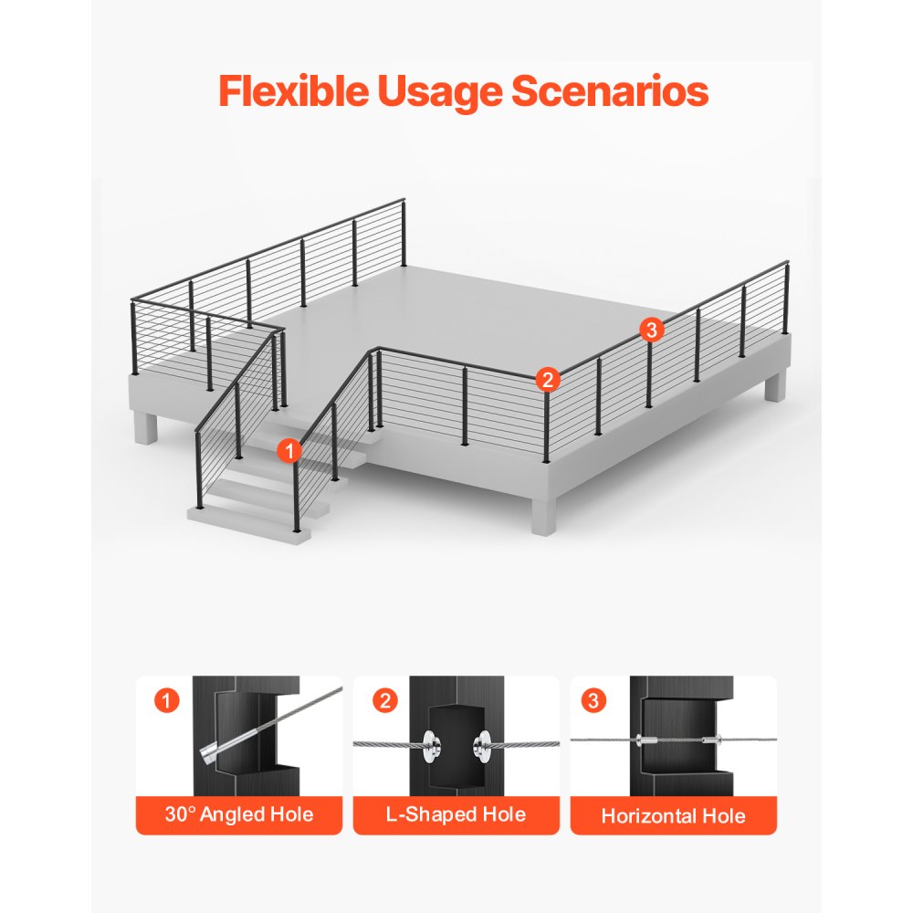 Protección para múltiples escenas: Nuestro poste de riel de cable es adecuado para protección tanto en interiores como en exteriores, incluidas terrazas, escaleras, porches, cercas, patios, balcones, jardines, edificios residenciales, oficinas comerciales, hoteles, garajes y más