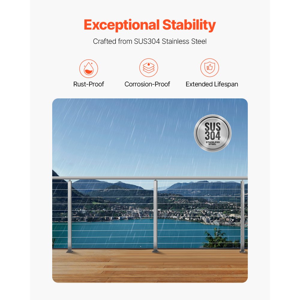 Resistente y duradero: Nuestro poste de pasamanos de cable está fabricado con acero inoxidable SUS304 de alta calidad, que ofrece una excelente resistencia a la oxidación y protección contra la corrosión para una larga duración. Sin embargo, no se recomienda su uso en zonas costeras. Nota: Aplique aceite antioxidante al eje de la barandilla antes del primer uso
