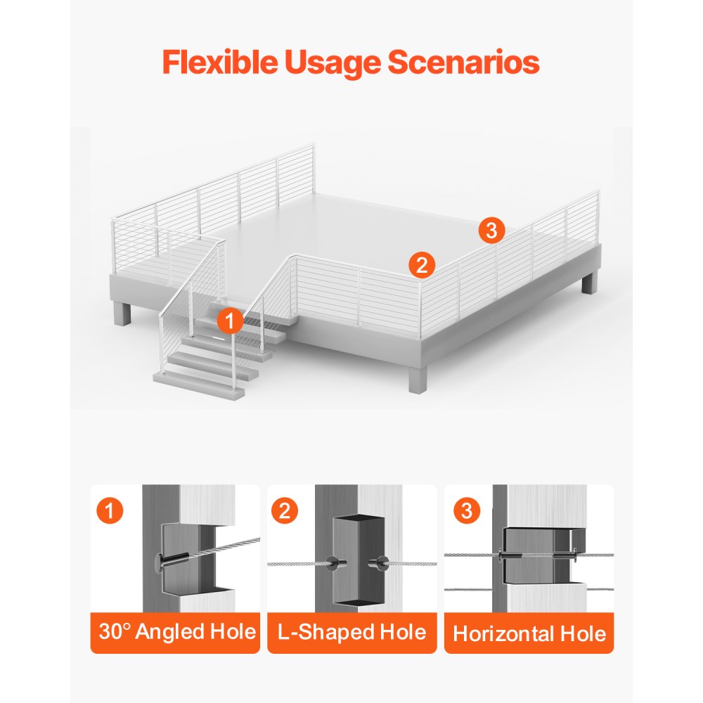 Protección para múltiples escenas: Nuestro poste de riel de cable es adecuado para protección tanto en interiores como en exteriores, incluidas terrazas, escaleras, porches, cercas, patios, balcones, jardines, edificios residenciales, oficinas comerciales, hoteles, garajes y más