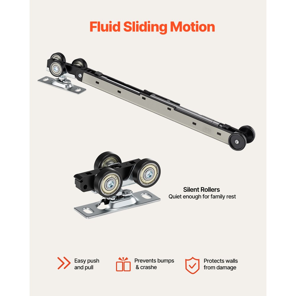 Deslizamiento silencioso y suave: Equipada con más de 100,000 rodamientos probados, herrajes de acero de alta calidad, suspensión de tres ruedas y guías y rieles duraderos, nuestra puerta corredera se desliza silenciosa y suavemente. Se desliza y se mueve fácilmente, evitando golpes y colisiones, a la vez que protege las paredes de daños