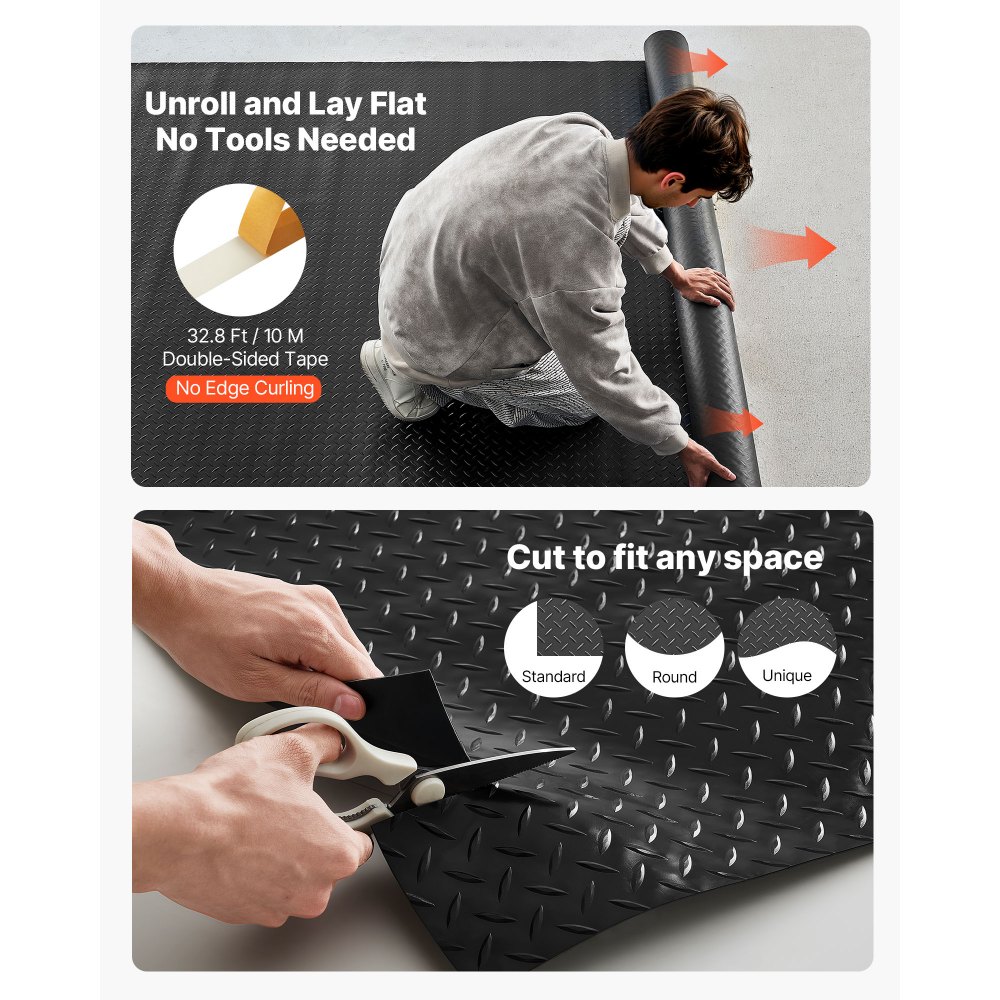 Estable y antideslizante: La superficie con patrón de diamante de este rollo de tapete para piso de garaje está diseñada para reducir el deslizamiento y mejorar la tracción, permitiendo caminar y estacionar con seguridad incluso en condiciones húmedas. Utilice la cinta adhesiva de doble cara incluida para una adhesión fuerte y duradera