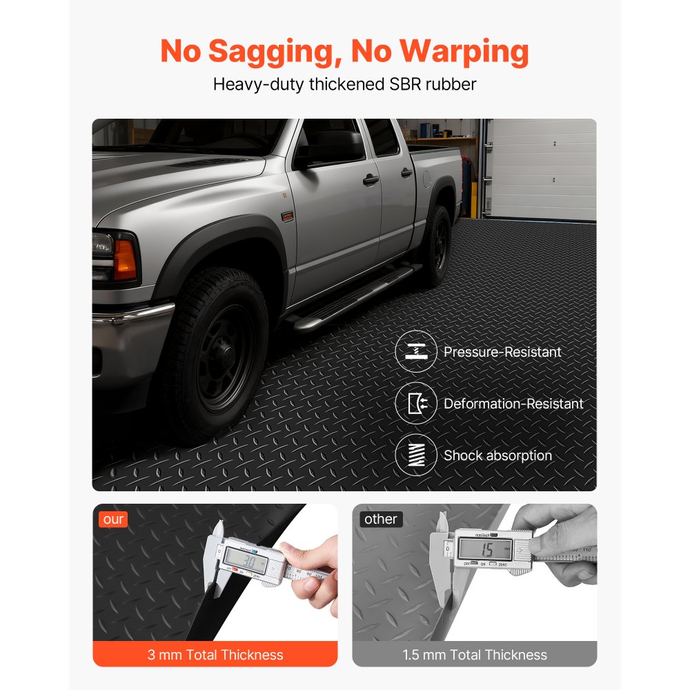 Caucho SBR de alta resistencia: Esta alfombrilla para garaje está fabricada con caucho SBR de alta resistencia de 3 mm de espesor, que proporciona una excelente resistencia al desgaste y a la presión. Soporta remolques, camiones y vehículos pesados sin deformarse, lo que garantiza una larga vida útil