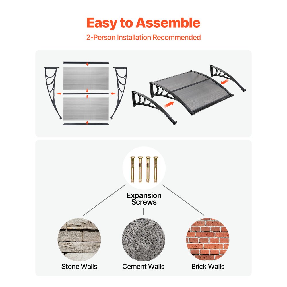 Instalación rápida: Este tejadillo para puerta exterior incluye un kit completo de accesorios, instrucciones de instalación claras y dos tipos de tornillos de montaje para paredes de ladrillo, hormigón o madera. Fácil de instalar por una sola persona. Mida su espacio para encontrar el ajuste perfecto