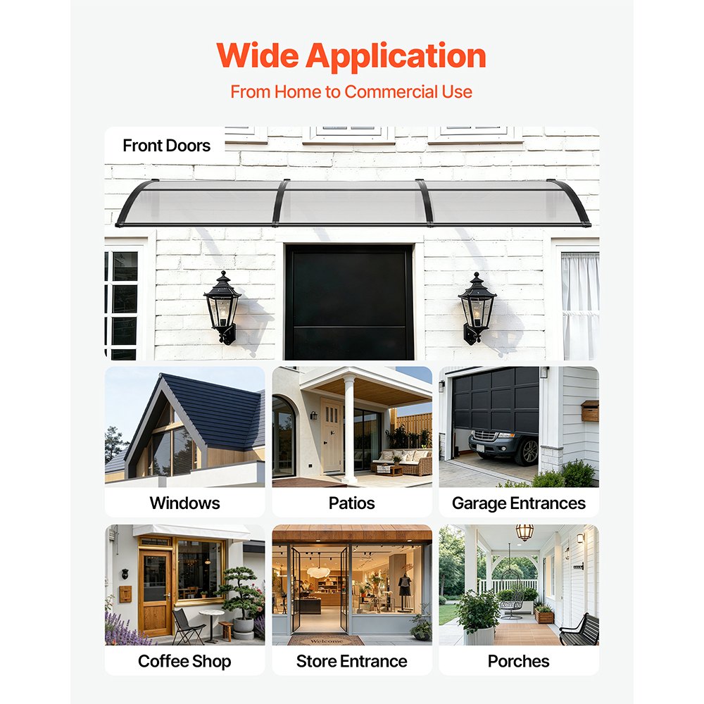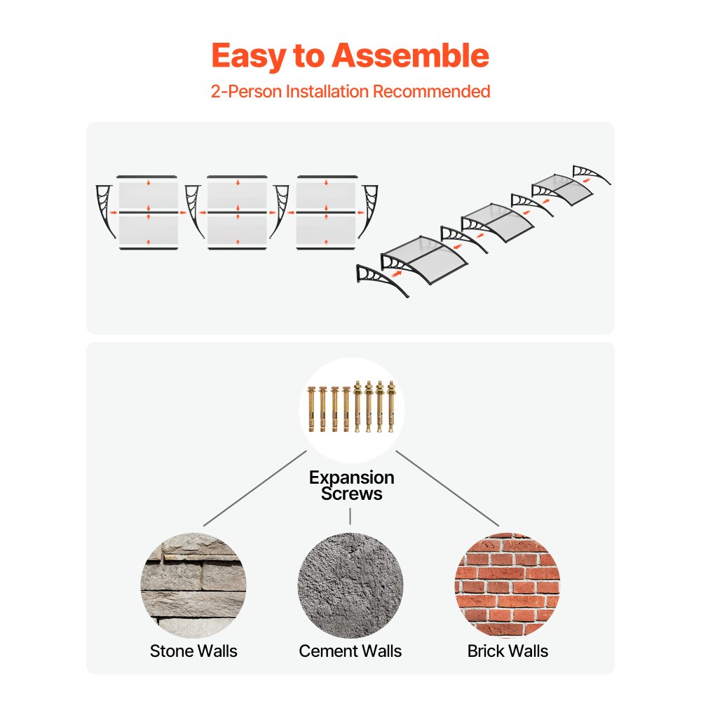 Instalación rápida: Esta marquesina para puerta exterior incluye un kit completo de accesorios, instrucciones de instalación claras y dos tipos de tornillos de montaje para paredes de ladrillo, hormigón o madera. Fácil de instalar por una sola persona. Mida su espacio para encontrar el ajuste perfecto