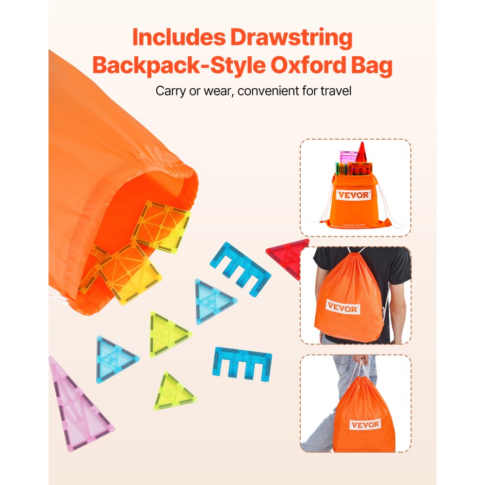 Mega Pack de 121 piezas: ¡da rienda suelta a la creatividad de tu hijo con el juego de fichas magnéticas de VEVOR! Este emocionante paquete incluye 121 piezas magnéticas (22 cuadrados, 6 triángulos rectángulos y 30 triángulos equiláteros), perfectas para construir estructuras altas, edificios y castillos que se mantengan firmes. Además, viene con una práctica bolsa de nailon con cordón para facilitar su transporte.