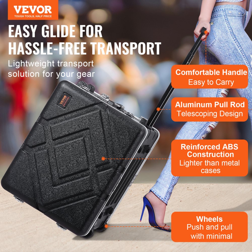 Fácil de transportar: el maletín con bastidor, con asa de aluminio y ruedas, simplifica el traslado de su equipo entre ubicaciones. Es una opción ideal para profesionales que valoran el transporte eficiente y sin complicaciones de equipos montados en bastidor.