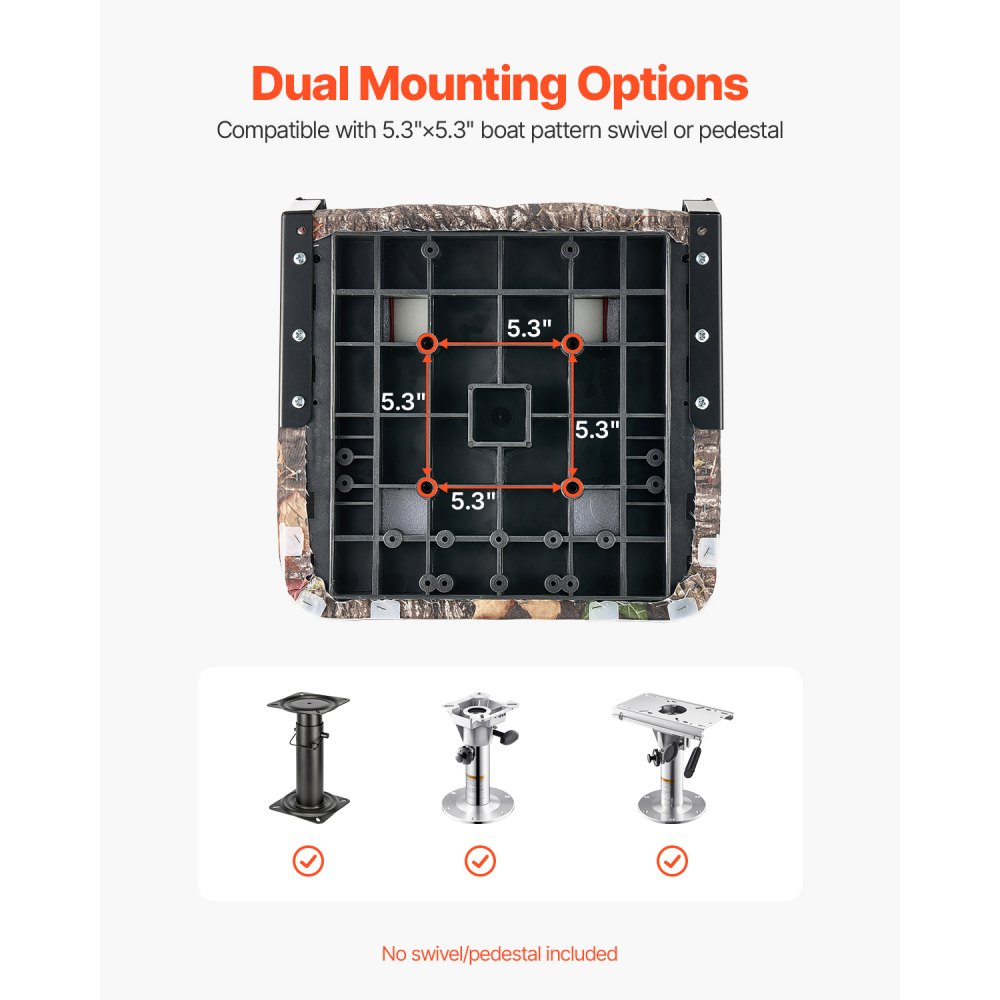 Instalación con orificios para pernos: El asiento plegable para botes tiene un espacio entre orificios para pernos de 5,3 pulgadas. Proporcionamos tornillos y arandelas resistentes a la corrosión, lo que facilita la fijación segura del asiento a la mayoría de las bases o pivotes giratorios para botes. Tenga en cuenta que la base y el pivote giratorio para botes no están incluidos
