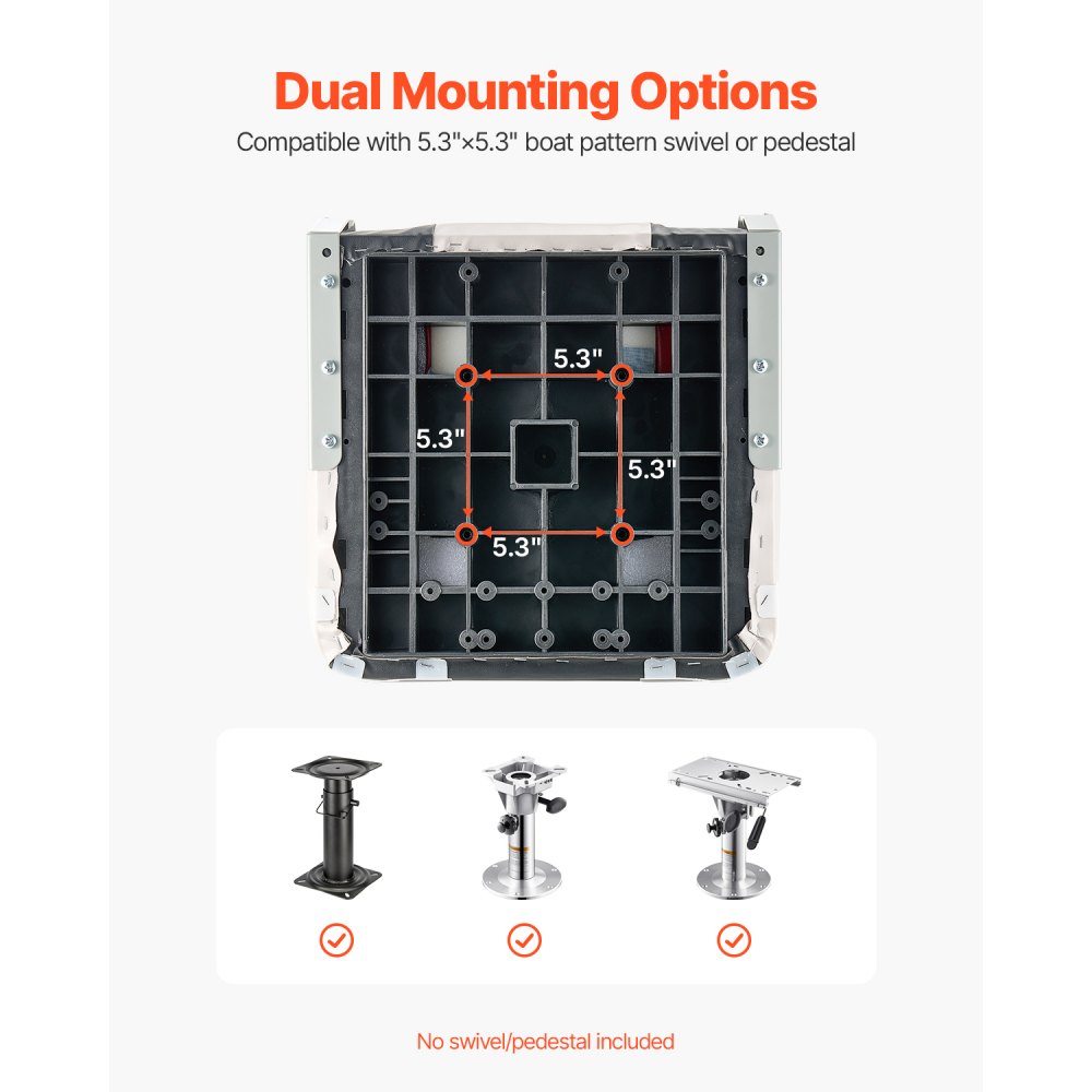 Instalación con orificios para pernos: El asiento plegable para botes tiene un espacio entre orificios para pernos de 5,3 pulgadas. Proporcionamos tornillos y arandelas resistentes a la corrosión, lo que facilita la fijación segura del asiento a la mayoría de las bases o pivotes giratorios para botes. Tenga en cuenta que la base y el pivote giratorio para botes no están incluidos
