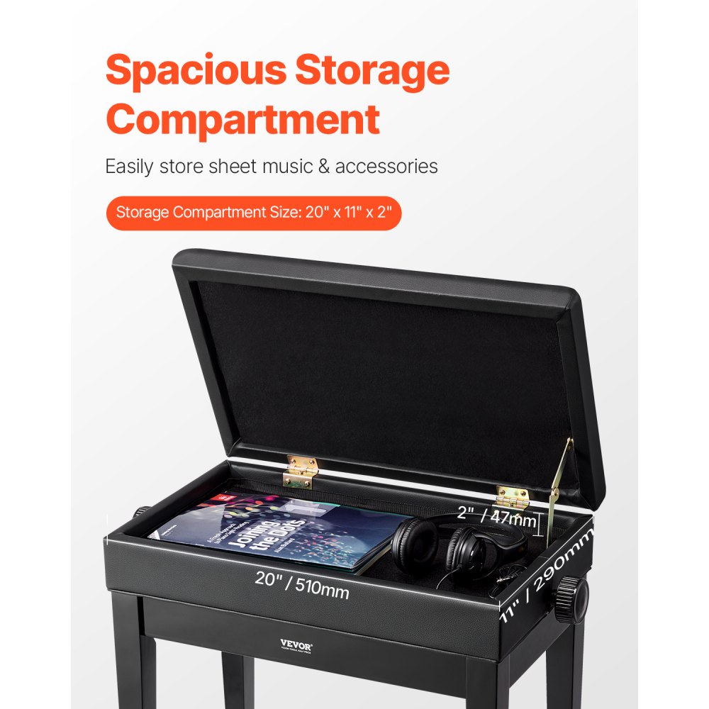 Amplio compartimento de almacenamiento: Con un espacioso compartimento de almacenamiento, este banco de piano ofrece un amplio espacio para guardar partituras, pequeños accesorios u otros suministros musicales. Mantenga su espacio de música ordenado y organizado mientras disfruta de un fácil acceso a todos sus elementos esenciales