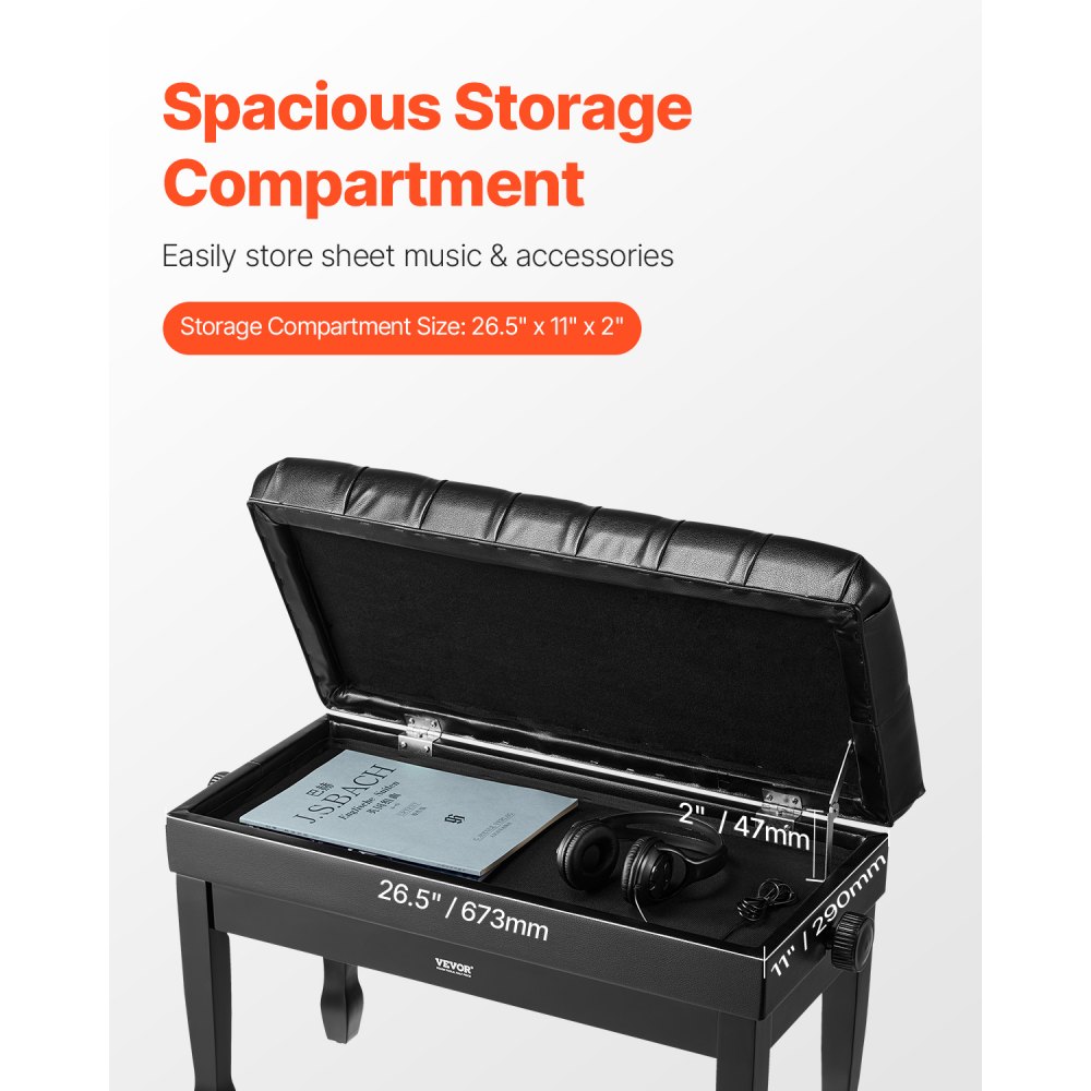 Amplio compartimento de almacenamiento: Con un compartimento de almacenamiento, este banco de piano le brinda un espacio generoso para guardar partituras, accesorios musicales o artículos personales. Mantenga su espacio limpio y organizado mientras tiene todo lo que necesita a mano