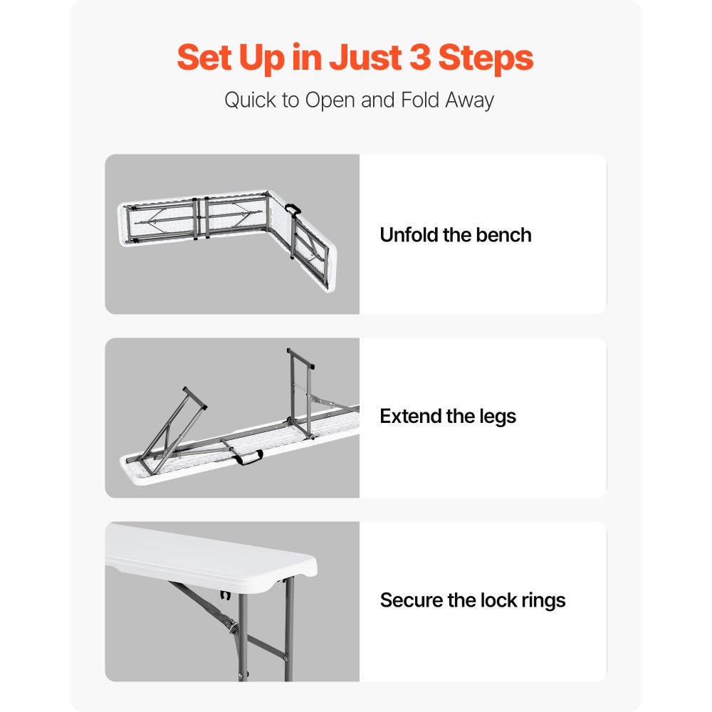 Asientos cómodos: este banco plegable de 1,82 m(72 x 11 x 17 pulgadas) de 1,82 m(1 pieza) y 1,83 m(6 pies) es muy portátil y liviano, y ofrece asientos cómodos sin necesidad de ensamblaje. Simplemente desempaquételo y úselo.