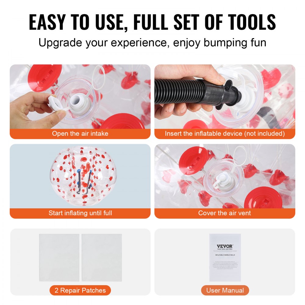 Material de alta calidad y diversión sin fin: ¡con las pelotas inflables de VEVOR, puedes sumergirte en una diversión sin fin! Fabricadas con PVC a prueba de explosiones de 0,8 mm, estas bolas de sumo son duraderas, seguras, impermeables y están diseñadas para evitar que se escape el aire. La excelente resistencia al desgarro, un avanzado sistema de válvulas y un cierre hermético prometen una diversión duradera.