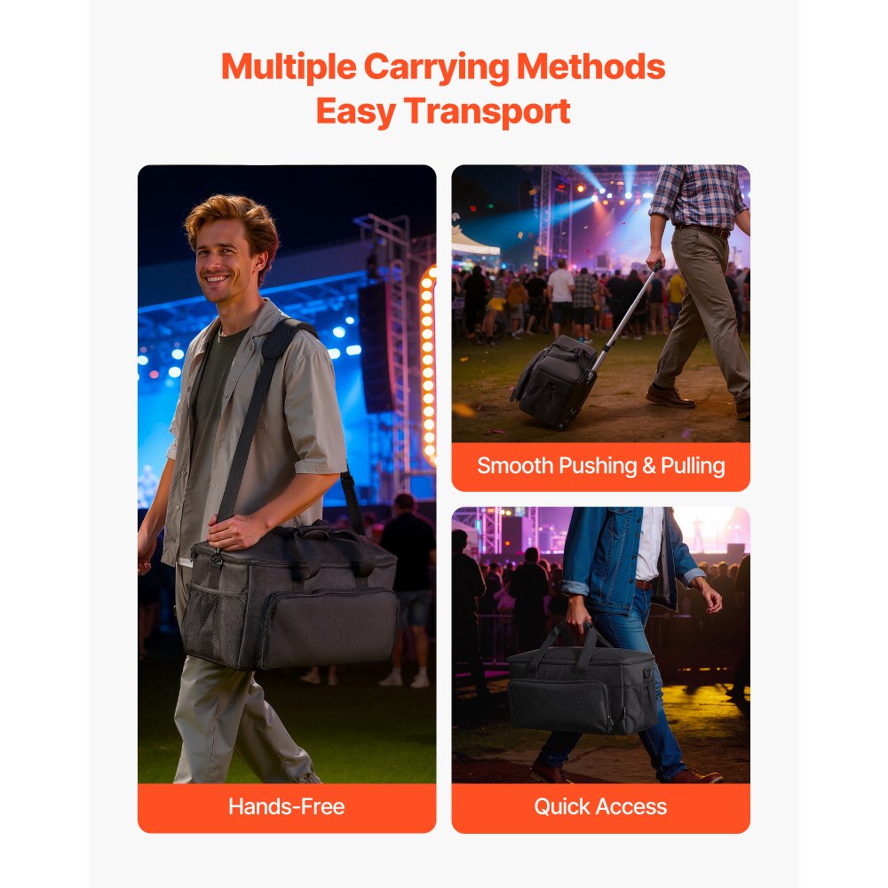 Opciones de transporte versátiles: Nuestra bolsa de viaje para DJ ofrece tres opciones de transporte para DJ, músicos y viajeros. Las ruedas inferiores facilitan el transporte, el asa es ideal para llevarlo rápidamente y la correa para el hombro permite llevarlo con las manos libres