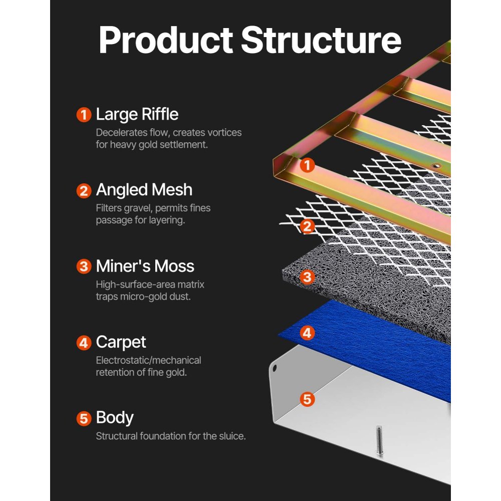 Extracción productiva de oro: Los surcos crean turbulencias en el canal de sedimentos. También capturan escamas de oro y pequeñas partículas de oro en el musgo de minero de vinilo tejido preinstalado.