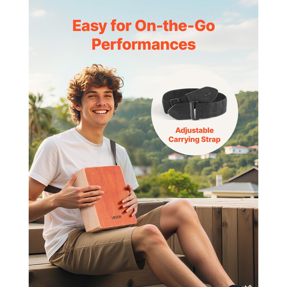 Toca donde quieras, ligero: Disfruta de la comodidad de tener las manos libres con la correa ajustable incluida. Ya sea que estés improvisando en la calle, tocando al aire libre o viajando ligero, este cajón está diseñado para acompañarte a donde te lleve el ritmo