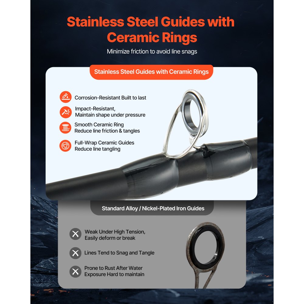 Anillos guía de cerámica: Fabricados en robusto acero inoxidable, estos anillos guía ofrecen una excelente resistencia a la corrosión y mantienen su forma incluso bajo fuertes impactos. Los anillos de cerámica lisos minimizan los enredos en la línea, garantizando una experiencia de pesca más fluida y eficiente