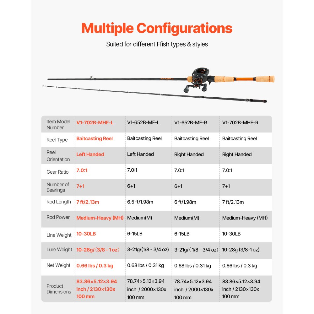Caña de Pescar y Carrete Baitcasting, Caña de Fibra de Carbono de 2,13 m IM7, con Rodamientos de Bolas 7+1 y Relación de Transmisión 7.0:1 y Mango de Corcho, Ideal para Zurdos, Media-Pesada - Deporte y recreación