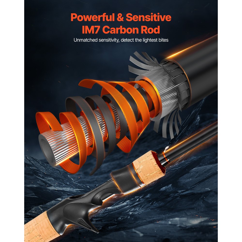 Diseño de materiales de alta calidad: Esta combinación de cañas de pescar consta de una robusta y sensible caña de carbono IM7, ligera pero resistente, que ofrece una excelente sensibilidad incluso a las picadas más leves. El mango de corcho es antideslizante y absorbe el sudor, lo que garantiza un agarre cómodo y una experiencia de pesca placentera
