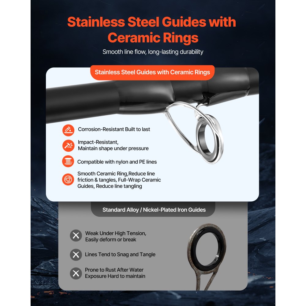 Anillos guía de alta calidad: Fabricados en robusto acero inoxidable, estos anillos guía ofrecen una excelente resistencia a la corrosión y mantienen su forma incluso bajo fuertes impactos. Los anillos de cerámica lisa minimizan los enredos de la línea, garantizando una experiencia de pesca más fluida y eficiente