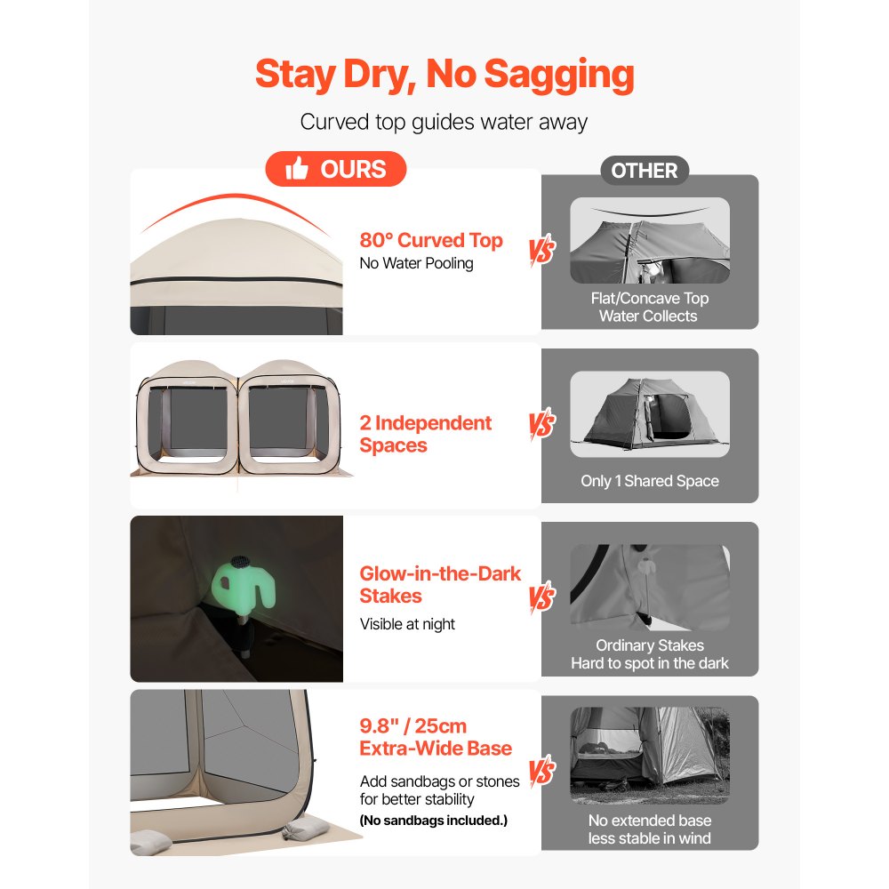 Estructura estable y resistente al viento: Los postes reforzados de fibra de vidrio y acero mantienen la carpa plegable en pie incluso con viento. El diseño curvo de la parte superior evita la acumulación de agua y que se hunda