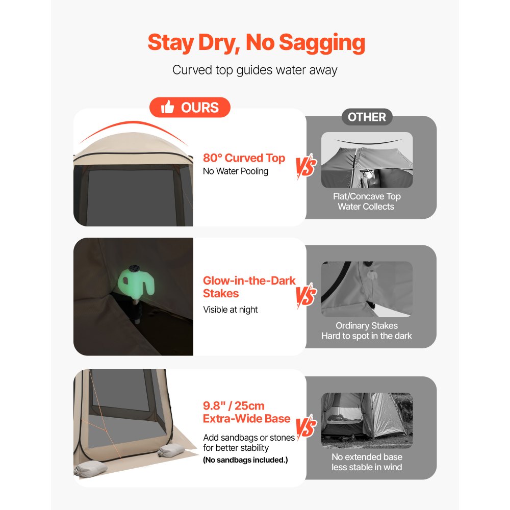Estructura estable y resistente al viento: Los postes reforzados de fibra de vidrio y acero mantienen la carpa plegable en pie incluso con viento. El diseño curvo de la parte superior evita la acumulación de agua y que se hunda