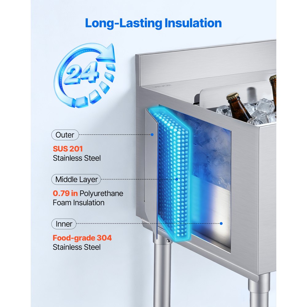 Aislamiento de larga duración: Este contenedor de hielo comercial utiliza acero inoxidable 304 y un grueso aislamiento de espuma de poliuretano para mantener la temperatura fría hasta por 24 horas. Se garantiza el contacto seguro con alimentos en entornos profesionales