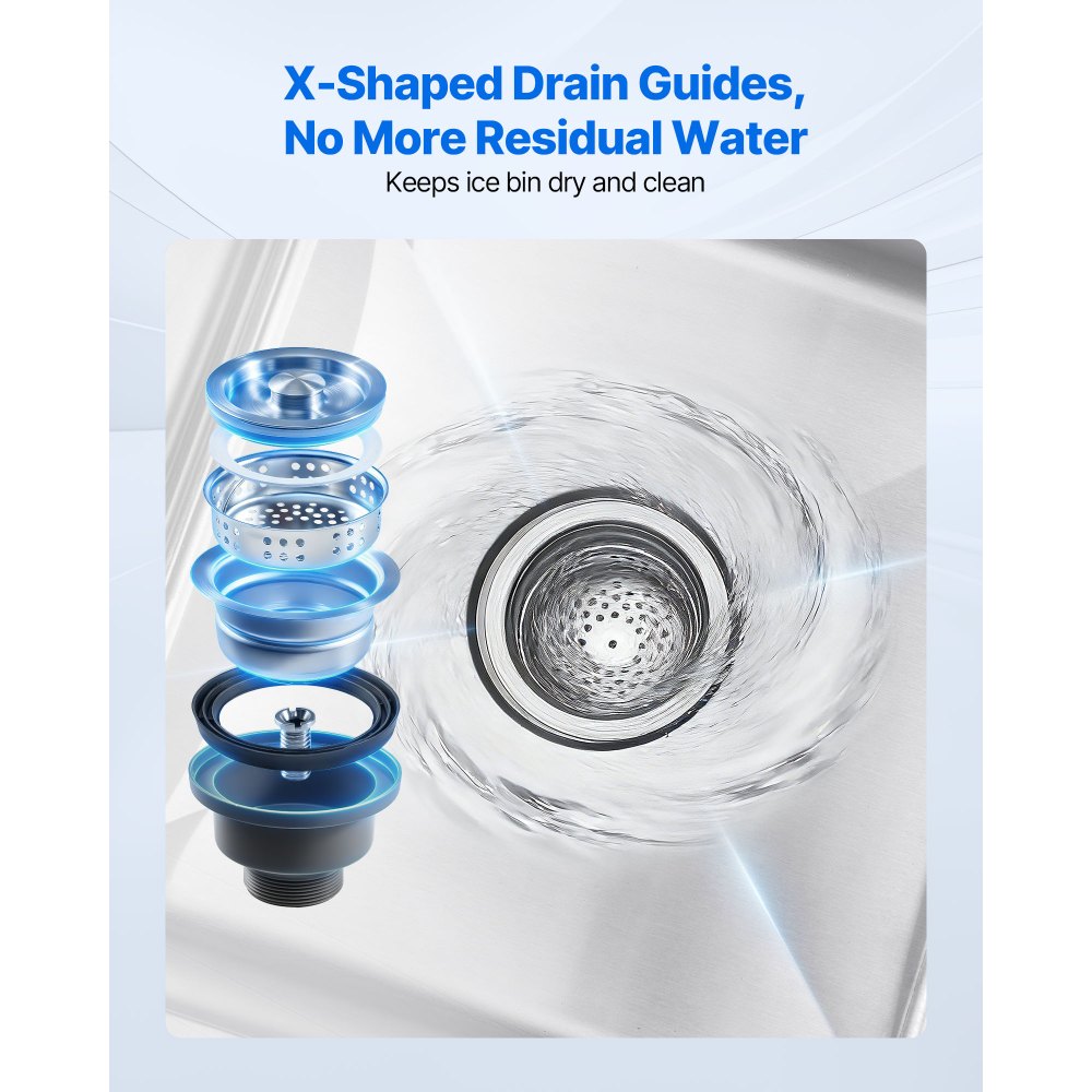 Sistema de drenaje suave: Este depósito de hielo de acero inoxidable cuenta con un diseño de drenaje en forma de X que evacua el agua eficientemente. El interior seco facilita la limpieza y el mantenimiento durante el uso comercial diario