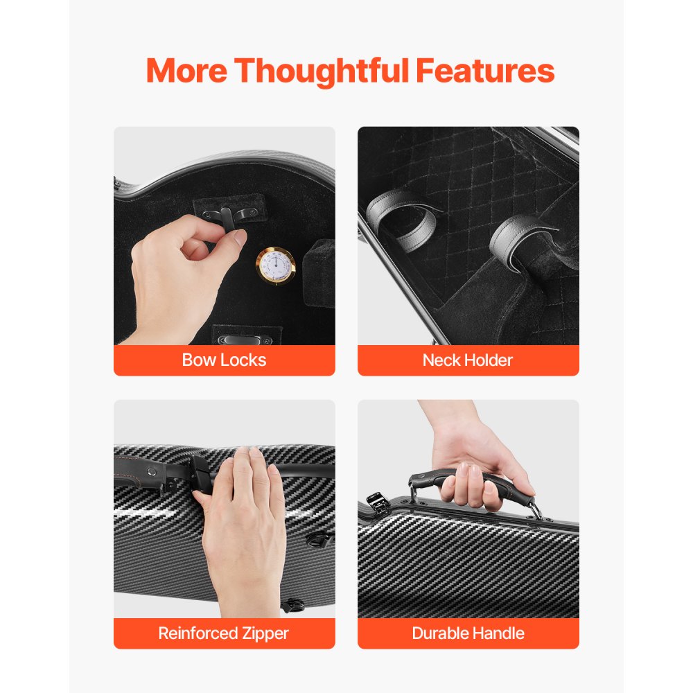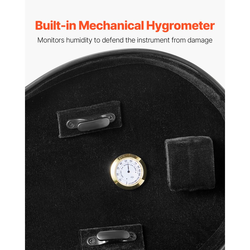 Estructura de ingeniería de precisión: Este estuche para violín incluye un higrómetro integrado para controlar la humedad y reducir el riesgo de agrietamiento o deformación de la madera. Los soportes para arcos tienen ranuras de bloqueo, cremalleras antideflagrantes y un asa reforzada para un uso duradero