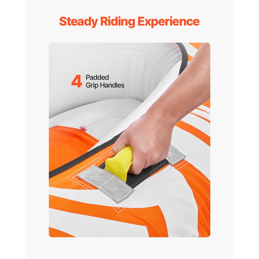 Estabilidad y comodidad: Los flotadores remolcables para 2 personas están diseñados para brindar comodidad y seguridad, y cuentan con 4 manijas acolchadas para un agarre más cómodo y seguro. Las manijas resistentes garantizan que mantenga el control y brindan una experiencia acuática estable y segura