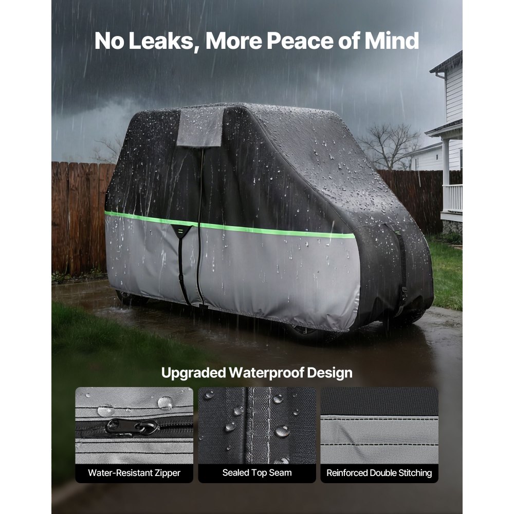 Protección contra el agua mejorada: Con un revestimiento impermeable de poliuretano, costuras dobles reforzadas y una cinta sellada en la costura superior, nuestra funda impermeable para carrito de golf está diseñada para impedir la entrada de lluvia. Incluso durante lluvias intensas, su estructura mejorada ayuda a mantener el interior seco y cómodo para estacionar al aire libre