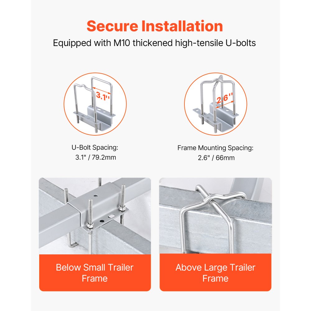 Dos métodos de instalación: Los pernos en forma de U se pueden instalar de manera flexible en vigas de remolque con un ancho de hasta 76 mm. Estos dos métodos de instalación son adecuados para diferentes modelos de remolques, incluidos remolques de esquí y remolques de barcos de pesca. Esta guía se puede instalar incluso de forma segura en remolques con estructura más pequeña. El material de acero grueso de alta resistencia M8 mejorado garantiza una instalación firme y estable sin movimiento ni deformación excesivos.