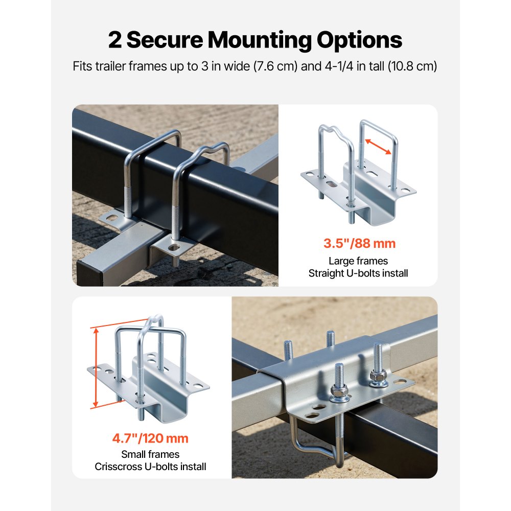 2 opciones de montaje: Se adapta a chasis de remolque de hasta 7,6 cm de ancho y 10,8 cm de alto. Elija entre dos métodos de instalación seguros para adaptarse a vigas de remolque grandes o pequeñas. Incluye pernos en U M10 de alta resistencia que se mantienen firmes y no se aflojan ni se rompen con el tiempo