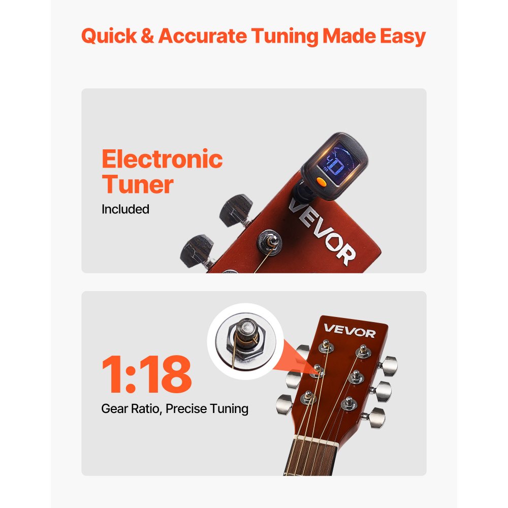 Toca con facilidad: Esta guitarra acústica incluye un afinador para una afinación rápida y precisa. El diapasón de palisandro liso y los bordes pulidos proporcionan un agarre cómodo, garantizando una experiencia de interpretación más placentera