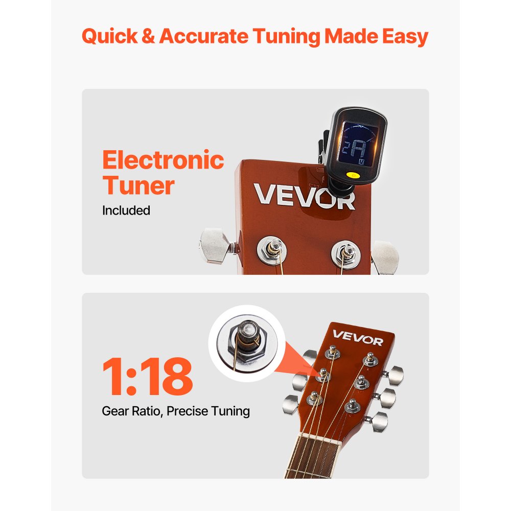 Toca con facilidad: Esta guitarra acústica incluye un afinador para una afinación rápida y precisa. El tacto suave del palisandro y los bordes pulidos proporcionan un agarre cómodo, garantizando una experiencia de interpretación más placentera