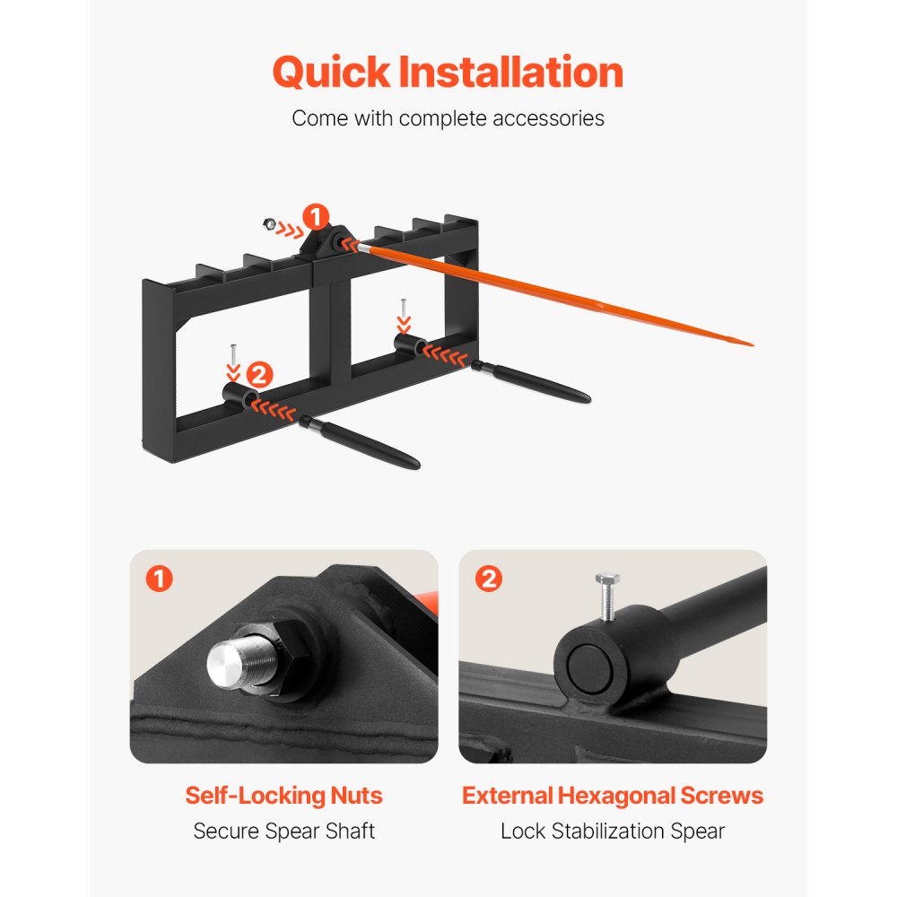 Fácil instalación: con menos componentes y un montaje sencillo, incluso los principiantes pueden instalar lanzas de heno para tractores sin esfuerzo. Las tuercas autoblocantes y los tornillos hexagonales externos incluidos aseguran las lanzas largas, lo que garantiza un uso seguro y sin preocupaciones.