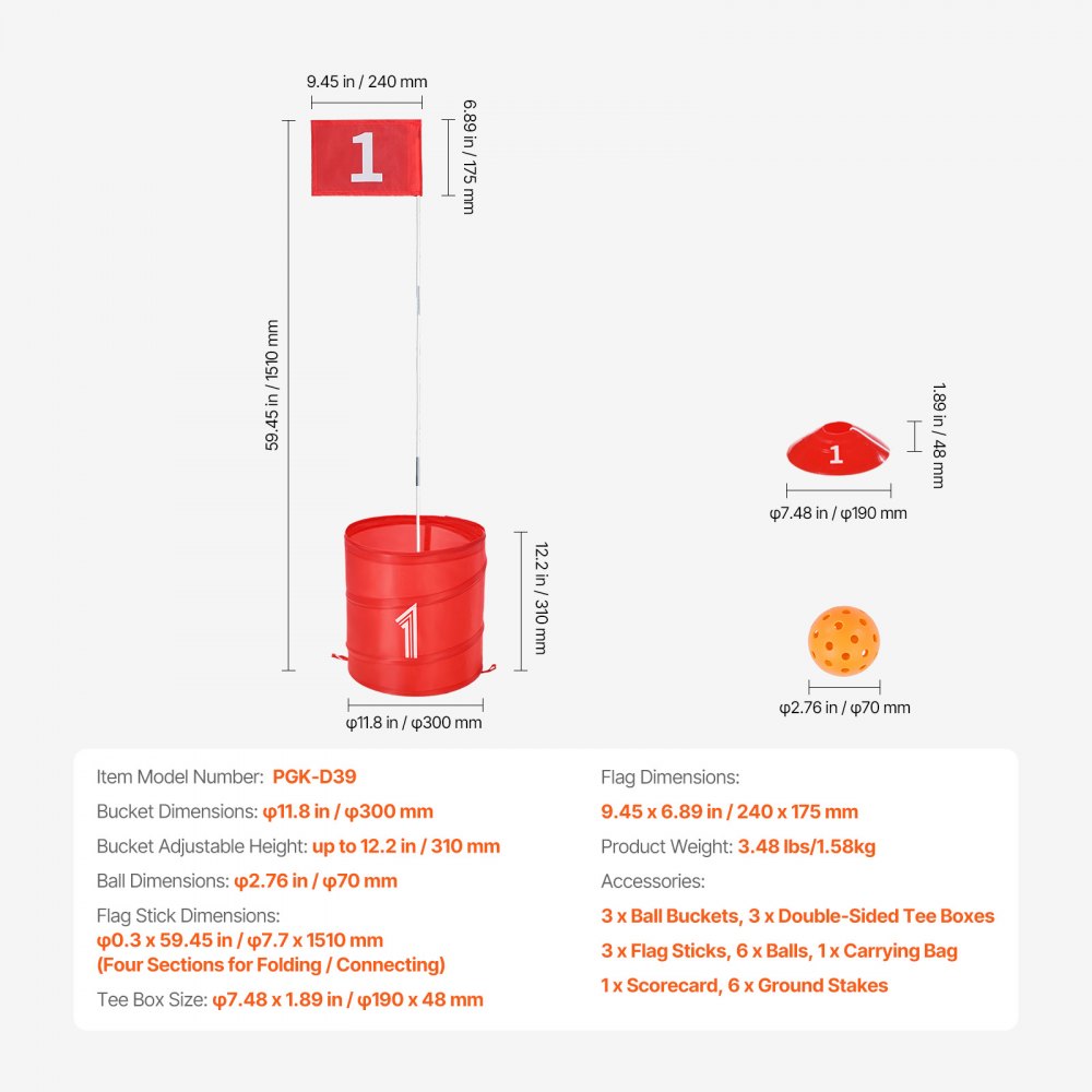 Pelota de golf: La pelota de pickleball de 2,76 pulgadas/70,00 mm es más grande y más fácil de golpear, lo que hace que el juego de golf con cubo sea adecuado para principiantes y niños.
