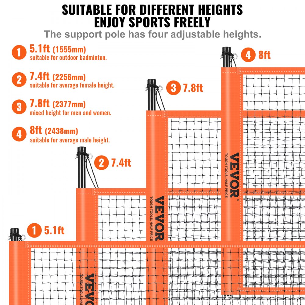 Altura fácilmente ajustable: el poste de soporte tiene cuatro alturas ajustables: 5,1 pies (1555 mm), 7,4 pies (2256 mm), 7,8 pies (2377 mm) y 8 pies (2438 mm), lo que lo hace adecuado para bádminton al aire libre para mujeres, hombres y mujeres de nivel medio. altura. usuarios mixtos
