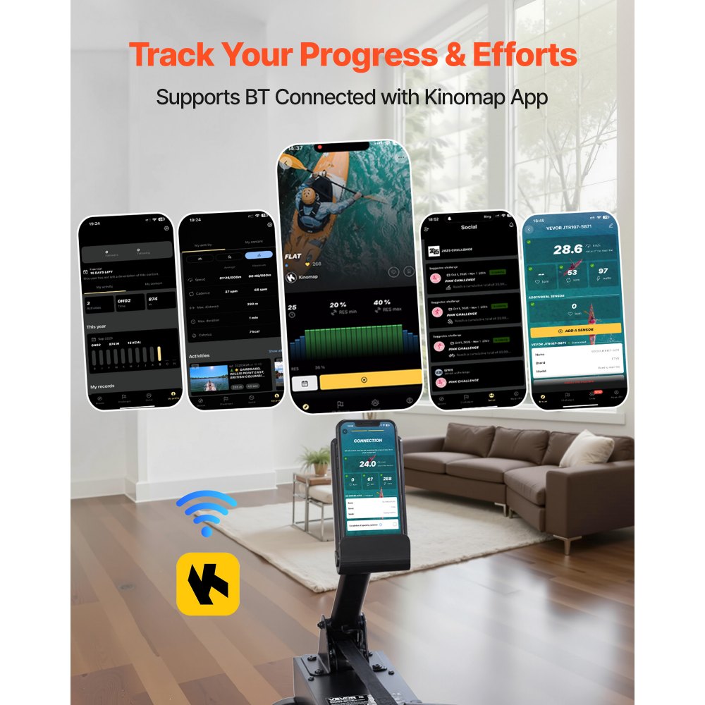 Conexión BT y seguimiento en tiempo real: La máquina de remo admite Kinomaps a través de una conexión BT para un entrenamiento virtual inmersivo para mantenerse motivado y realizar un seguimiento y guardar su historial de entrenamiento diariamente para ver su progreso y mantenerse motivado con cada sesión