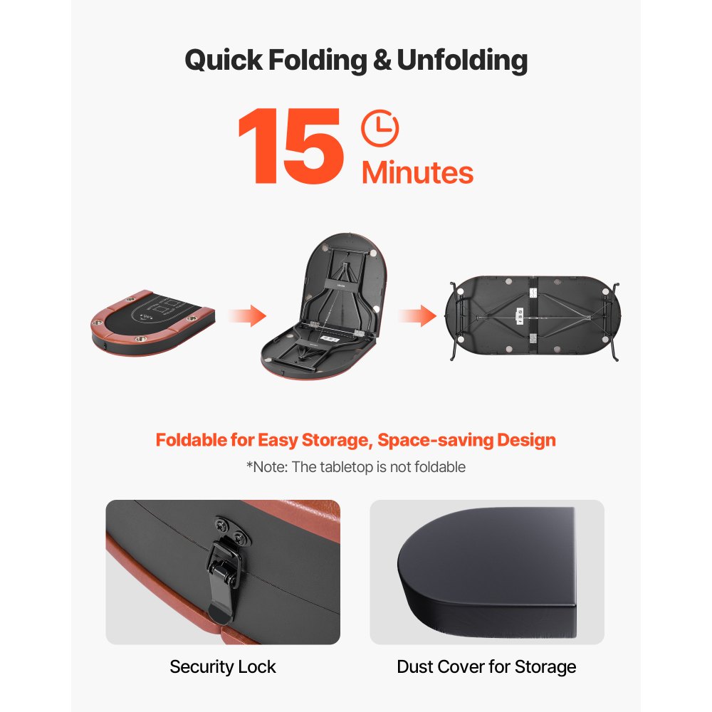 Fácil montaje: El diseño plegable con cierre de seguridad garantiza un montaje y plegado rápidos de la mesa de juego de casino. El cierre mantiene la mesa estable una vez plegada. Guárdela fácilmente en un rincón y manténgala limpia gracias a la funda antipolvo incluida
