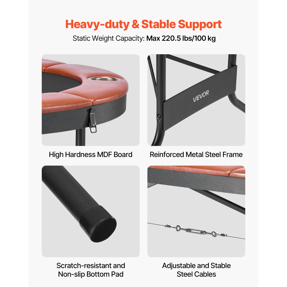 Estructura estable y robusta: Esta mesa de Texas Hold'em para 8 jugadores cuenta con una estructura metálica reforzada y un tablero de MDF. Las robustas patas metálicas soportan la alta presión del uso prolongado, mientras que el soporte triangular garantiza estabilidad y durabilidad