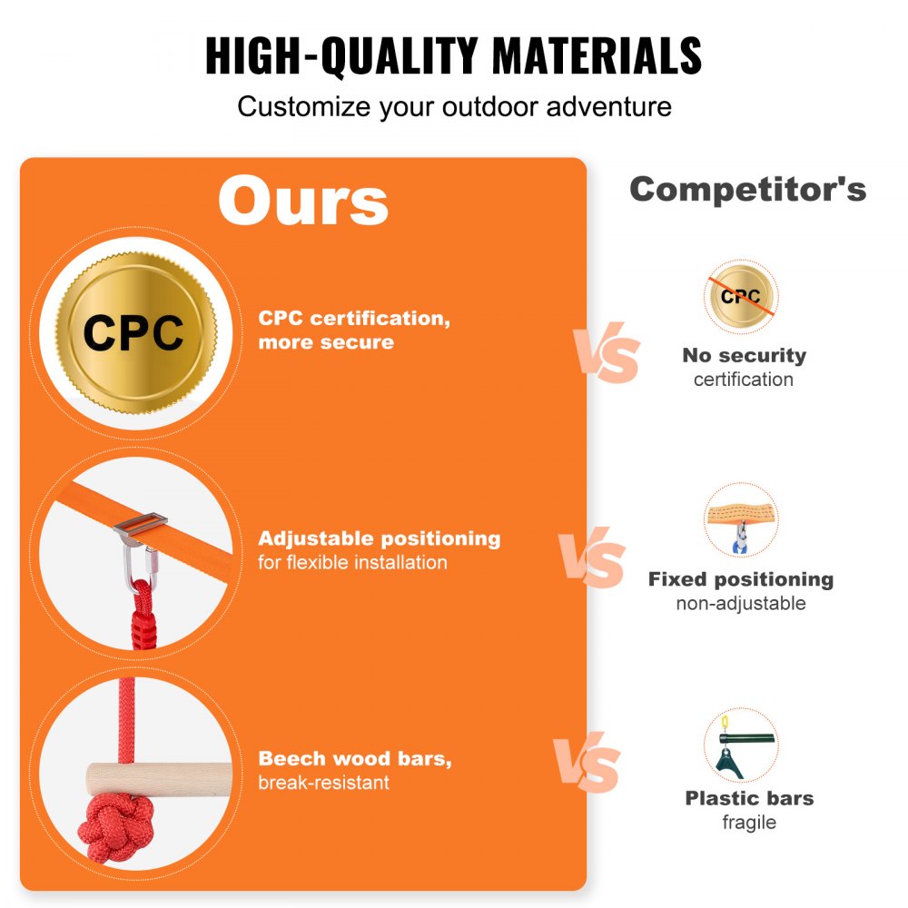 Alta seguridad: Cada conjunto de equipo de entrenamiento en el patio trasero puede contener hasta 500 libras, lo que es suficiente para que dos o más niños lo usen simultáneamente. Las correas con hebillas fundidas a presión, los tensores y las correas más anchas y gruesas resuelven el problema de las cuerdas combadas, bloqueándose de forma segura en los árboles para que los pies de los niños no toquen el suelo, para una experiencia de juego sin preocupaciones. Las correas termoplásticas de doble capa garantizan que el producto no se agriete, lo que permite a los niños sujetarlo de forma segura.