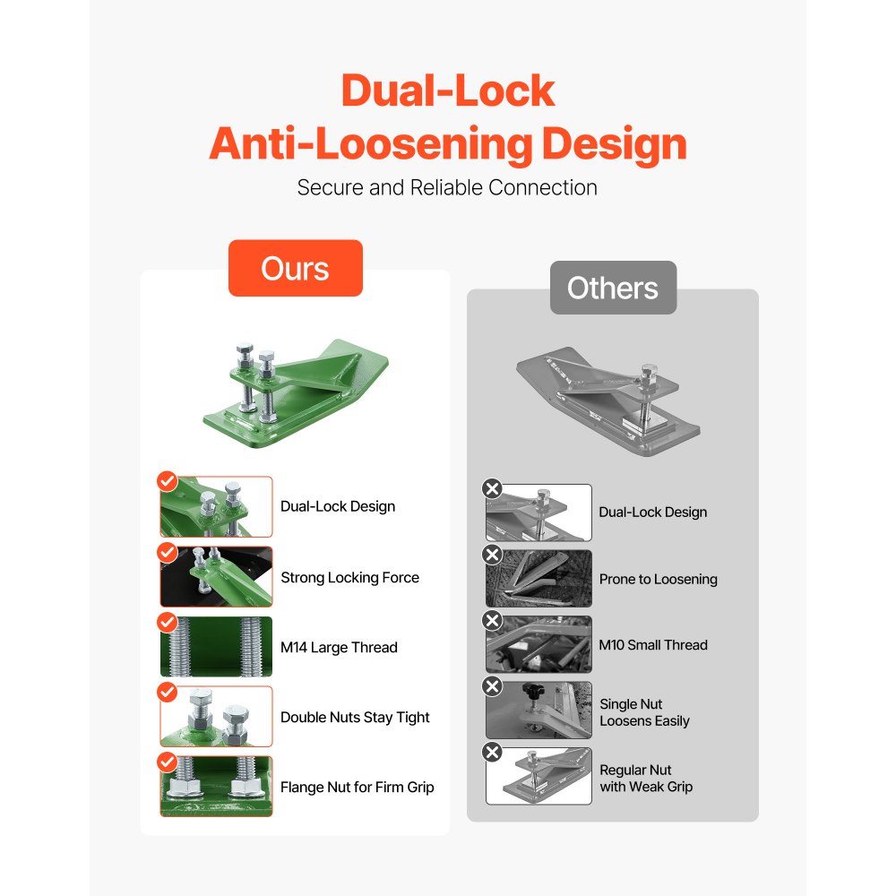 Diseño de doble cierre: A diferencia de los protectores de un solo cierre, nuestro protector de cubo para tractor cuenta con un diseño de doble cierre para una sujeción más firme. Los pernos tienen tuercas en la parte superior e inferior, además de roscas M14 más grandes, lo que garantiza una conexión estable para un uso confiable