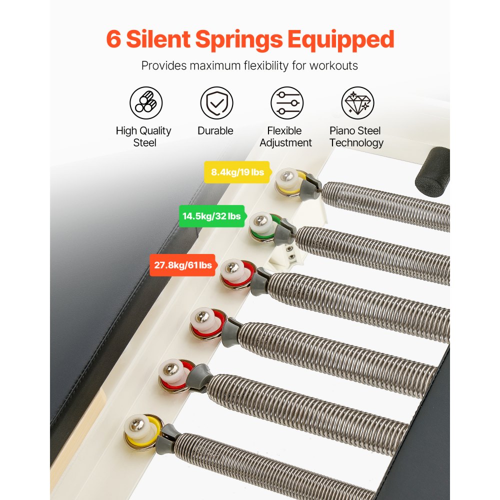 Resortes de primera calidad: Este equipo de pilates para ejercicios en casa utiliza resortes de acero de piano importados de alta calidad, que brindan 6 niveles de resistencia de resorte para ejercitar los músculos de la parte superior e inferior del cuerpo y el torso. El juego incluye 3 resortes fuertes (rojos), 1 resorte mediano (verde) y 2 resortes livianos (amarillos)