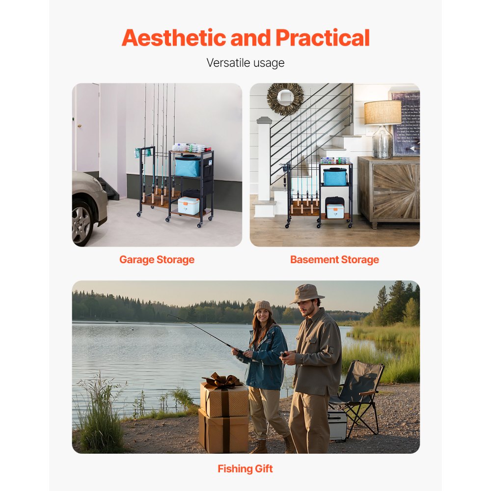 Almacenamiento multifuncional: El soporte multicapa para cañas de pescar ofrece un amplio espacio de almacenamiento, lo que permite colocar cajas grandes de aparejos de pesca y organizar con precisión los accesorios más pequeños. Esto ayuda a mantener tu equipo de pesca organizado