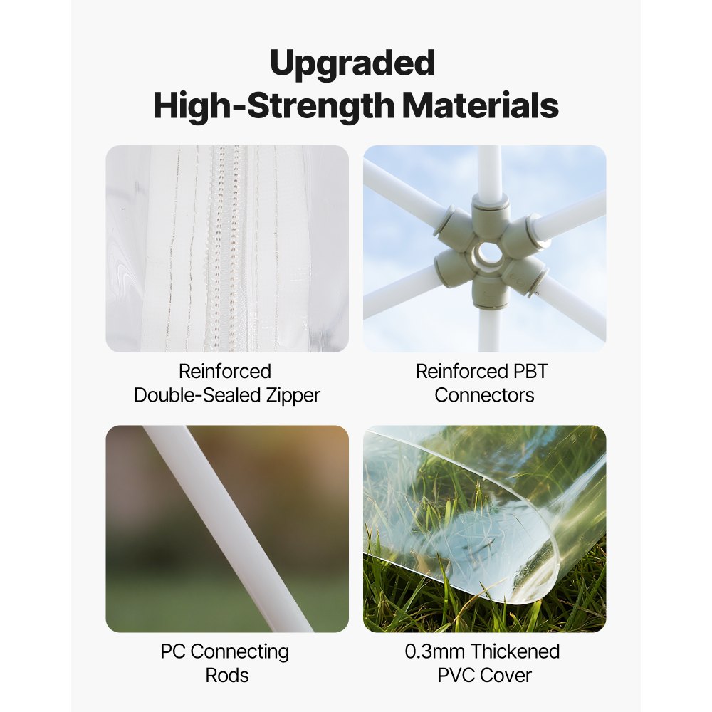 Duradera y resistente a la intemperie: Fabricada con postes de PC inoxidables, conectores PBT mejorados y PVC de 0,3 mm de grosor, la tienda de campaña tipo domo con forma de cúpula es apta para temperaturas de -15 °C a 40 °C, vientos de hasta 50 km/h y 40 kg de nieve. Incluye estacas, abrazaderas y sacos de arena para mayor estabilidad en condiciones adversas