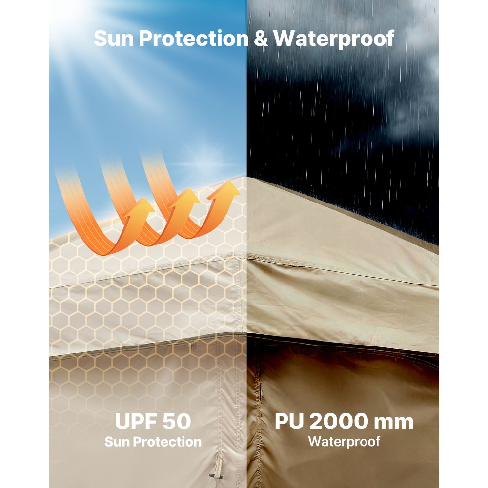 Protección solar e impermeabilidad: Nuestra tienda de campaña, fabricada con resistente tela Oxford 150D con FPS 50, protege de la luz solar intensa. Las ventanas laterales mejoran la circulación del aire. Gracias a su columna de agua de 2000 mm, la lluvia se dispersa rápidamente, manteniendo el interior de la tienda seco