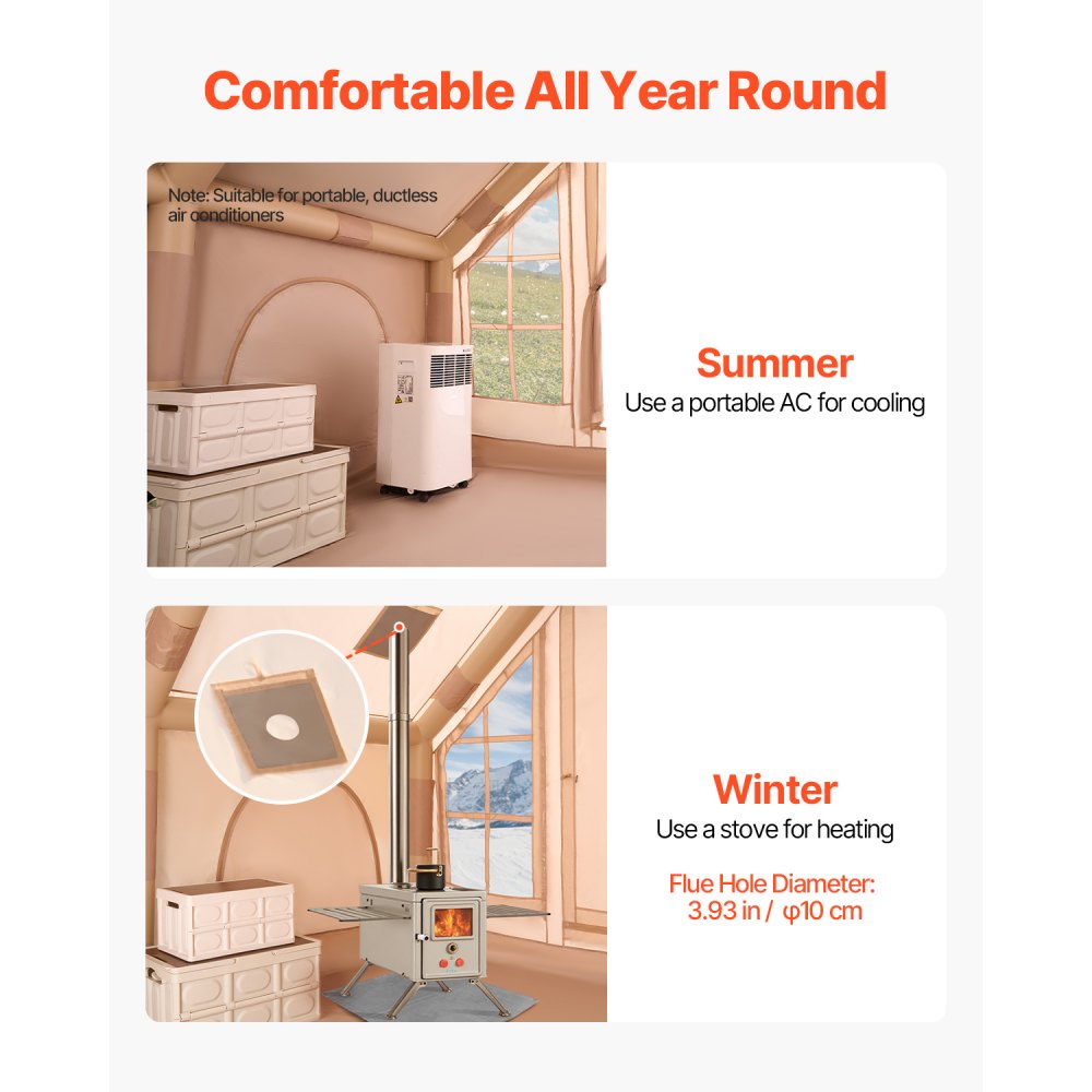 Comodidad para todas las estaciones: Equipada con un conector para estufa φ10 cm) y un puerto de aire acondicionado, esta lujosa carpa para acampar es ideal para enfriar o calentar su carpa en cualquier estación. La carpa incluye 2 puertas, 4 ventanas para una excelente ventilación y ventanas de malla para bloquear el polvo, lo que garantiza una estadía cómoda
