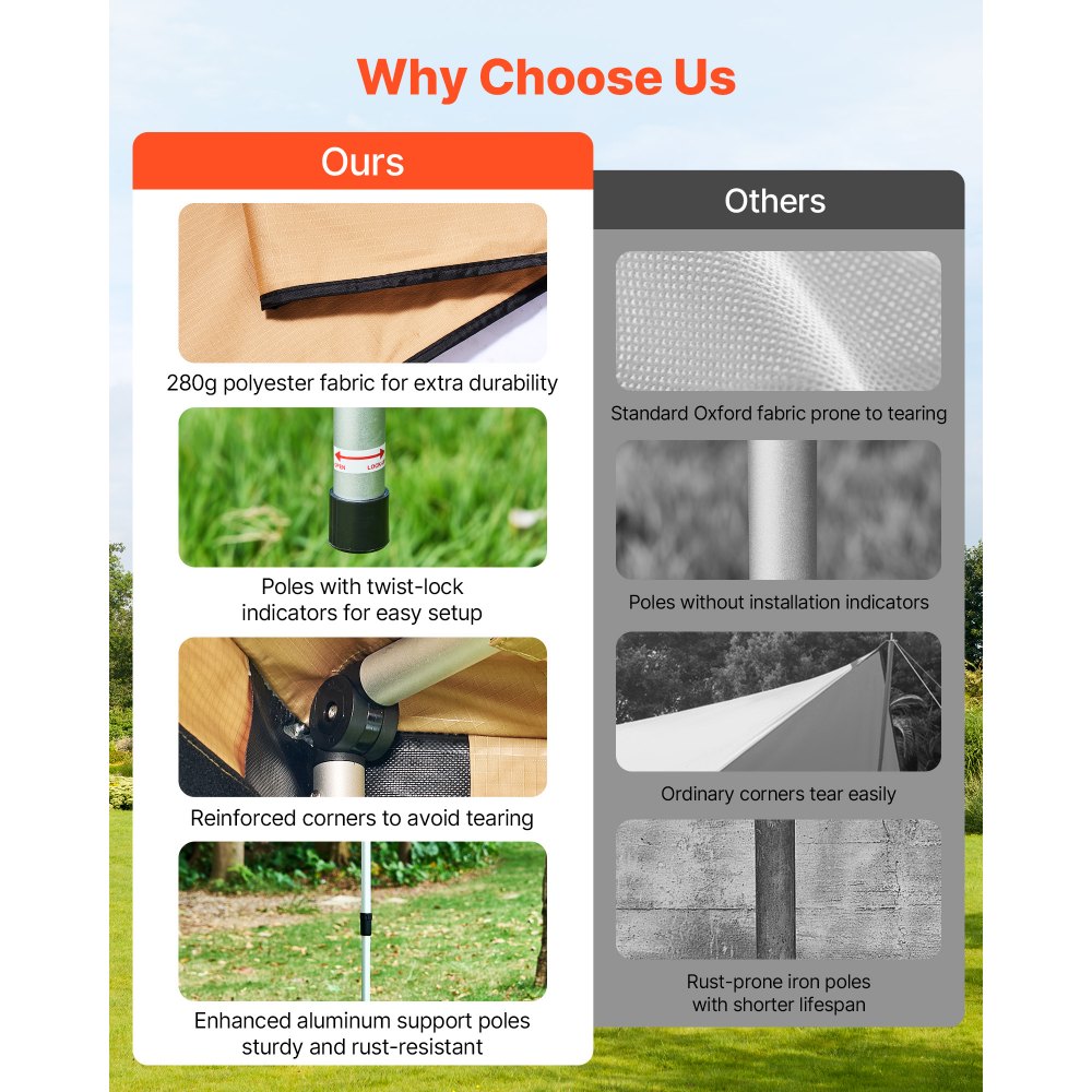 Instalación rápida: Su estructura telescópica con toldo y postes de soporte preinstalados simplifica el montaje. Nuestro toldo para SUV incluye instrucciones detalladas, permitiendo que incluso los principiantes lo instalen en minutos