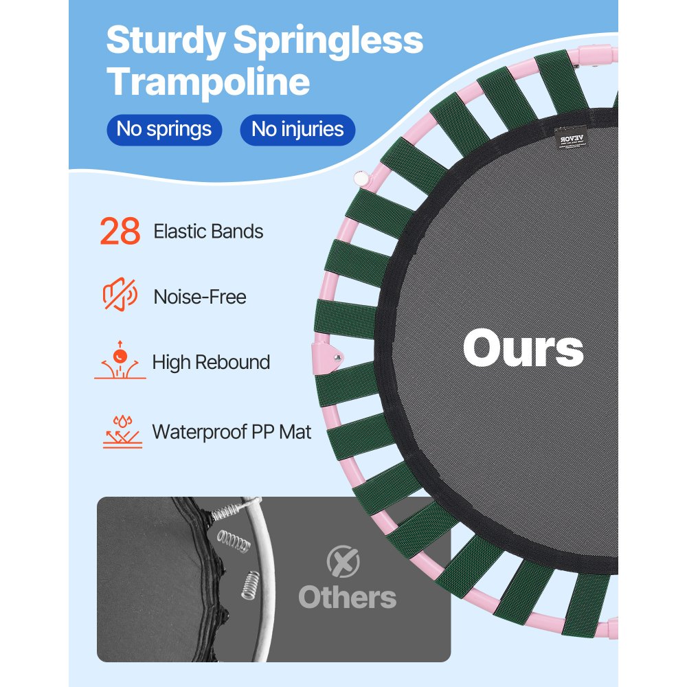 Lona de salto de alta calidad: la lona de salto de PP es resistente al desgaste, duradera, impermeable y fácil de limpiar. Con 28 bandas elásticas que soportan un peso máximo de 100 kg(220 lbs), la almohadilla de seguridad gruesa evita que los pies queden atrapados, lo que garantiza la seguridad en cada salto.